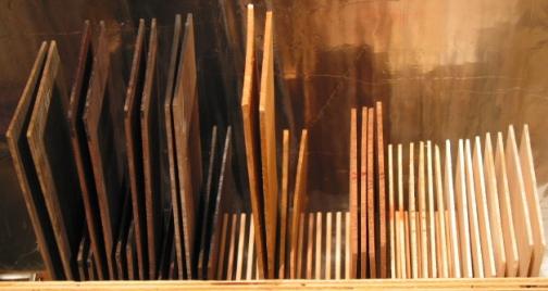 Guitar woods in drying rack waiting to be made into custom guitars
