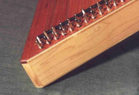 Hammered dulcimer detail showing color coded tuning pins and maple trim detail.