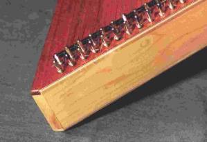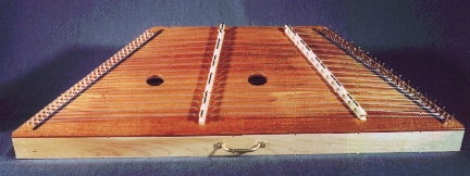 The Worland hammered dulcimer is a 16-15 with 16 double course treble strings and 15 double course bass strings. Treble strings can be played on both sides of the treble bridge for a total of 32 treble notes.