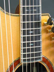 snowflake inlay on the fingerboard together with the burl rosette.