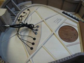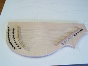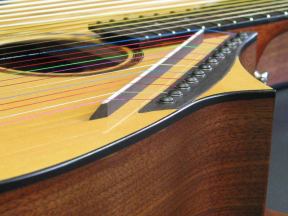 We planned to use 12 super treble strings so the lowest super treble string had to be as long as possible. Locating the super treble bridge lower on the body kept the string length as long as possible.