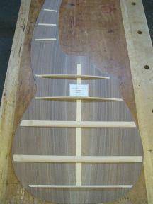 We decided to use Englemann spruce for the top which is not available in pieces large enough for a harp guitar so I planned to use a 2 piece bookmatched set for the top and a third piece for the bass arm.