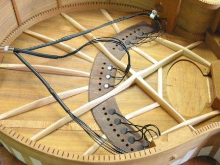 Inside of the Lyra harp guitar with the custom made K&K Sound pickup installed.